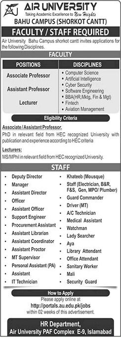 To apply for Air University Bahu Campus jobs, candidates need to fulfill the following criteria: