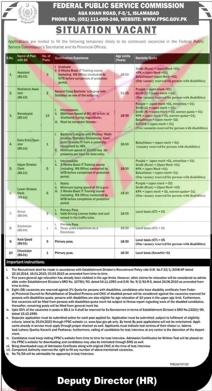 The Deadline to Apply for Fpsc Latest Advertisement 2023 | Federal Public Service Commission Jobs is  25 April 2023.