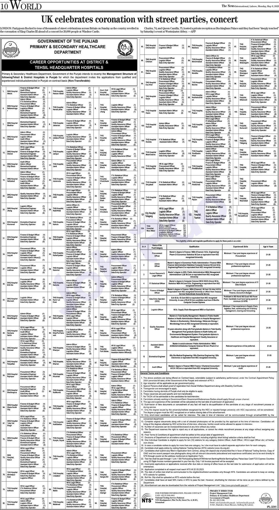 For the positions of Procurement Officers, Admin Officers, Human Resource and Legal Officers, IT/Statistical Officers, Bio-Medical Engineers, Finance and Data Entry Operators, Logistics Officers, Quality Assurance Officers, Budget Officers, Assistant Admin Officers, and Audit Officers, the Primary and Secondary Healthcare Department of Punjab is accepting applications from qualified candidates.