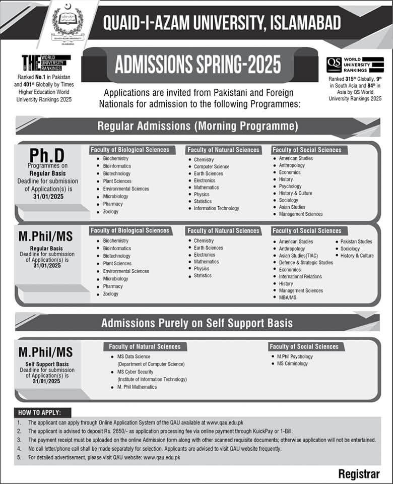 Quaid-e-Azam University QAU Islamabad Spring Admissions 2025: